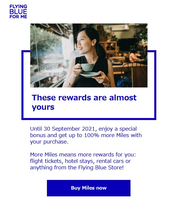 フライングブルーが昨日パリ時間の18時頃(日本時間で本日1時頃)に送ってきたメールはマイル販売のプロモ。マイル販売で最大100%のボーナスというもの。2021年 9月30日まで。