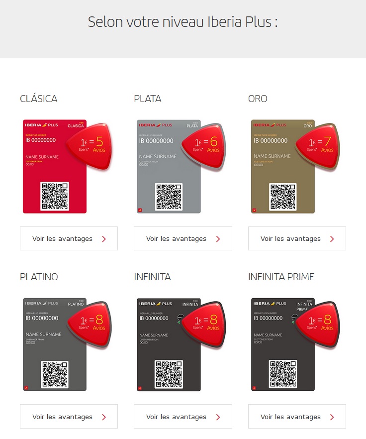 Iberia Plus に入会すると Clásica 会員ですが、この場合は 1€ あたり 5 Avios。会員レベルでこの係数は Plata 会員 6 Avios、Oro 会員 7 Avios、Platino 会員 8 Avios、Infinita 会員 8 Avios、Infinita Prime 会員 8 Avios となります。