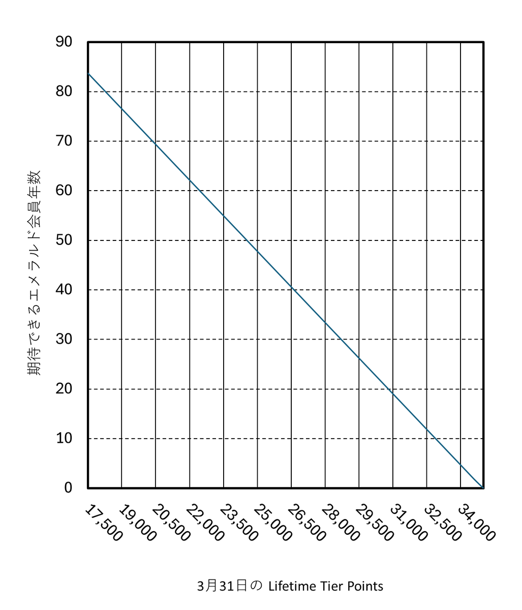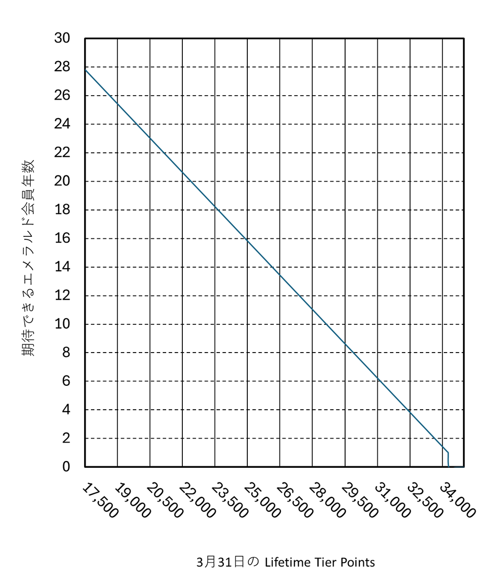 横軸は 3月31日時点での Executive Club Lifetime Tier Points です。縦軸は「Lifetime Gold」への不足 Tier Points を HND-OKA クラス J の反復で獲得するところを Royal Club に登録した場合、RJ でエメラルド会員でいられる年数です。