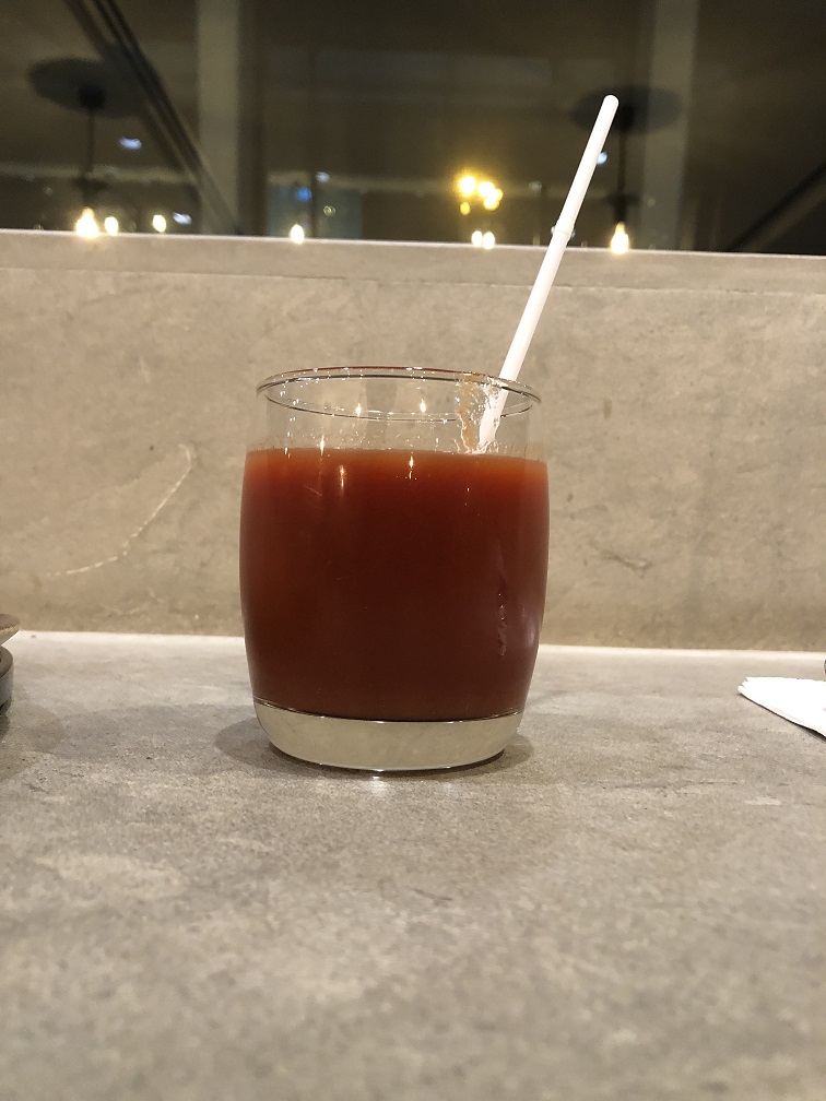 出発の儀は、寿司+カレー+シャンパンではなく、最近は健康的にトマトジュース。