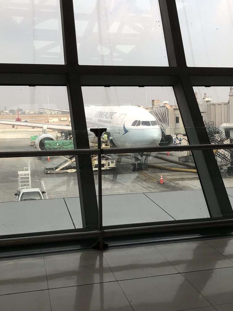 8:20 発 12:10 着のキャセイの BKK-HKG 第2便。空港までは BTS の始発で行こうかとぼんやり考えていましたが、昨日の地震で BTS の運行が無さそうな予感がしたので、前日夕方にタクシーを手配しました。よく考えると BTS が平常運行していても時間に余裕がなさすぎ。ここは車で向かうのが正解です。500 THB でしたが、地震のための余計な出費ではないというオチ。