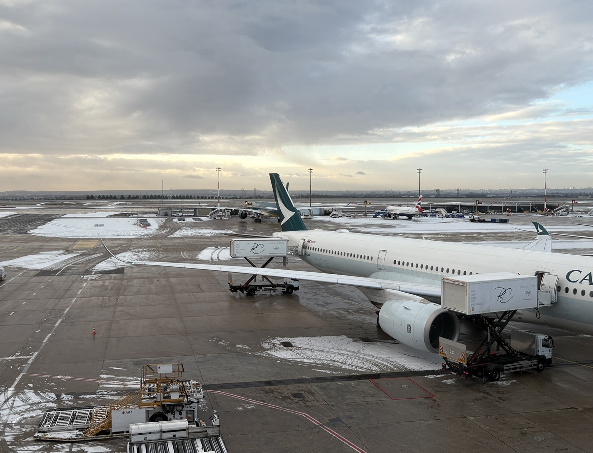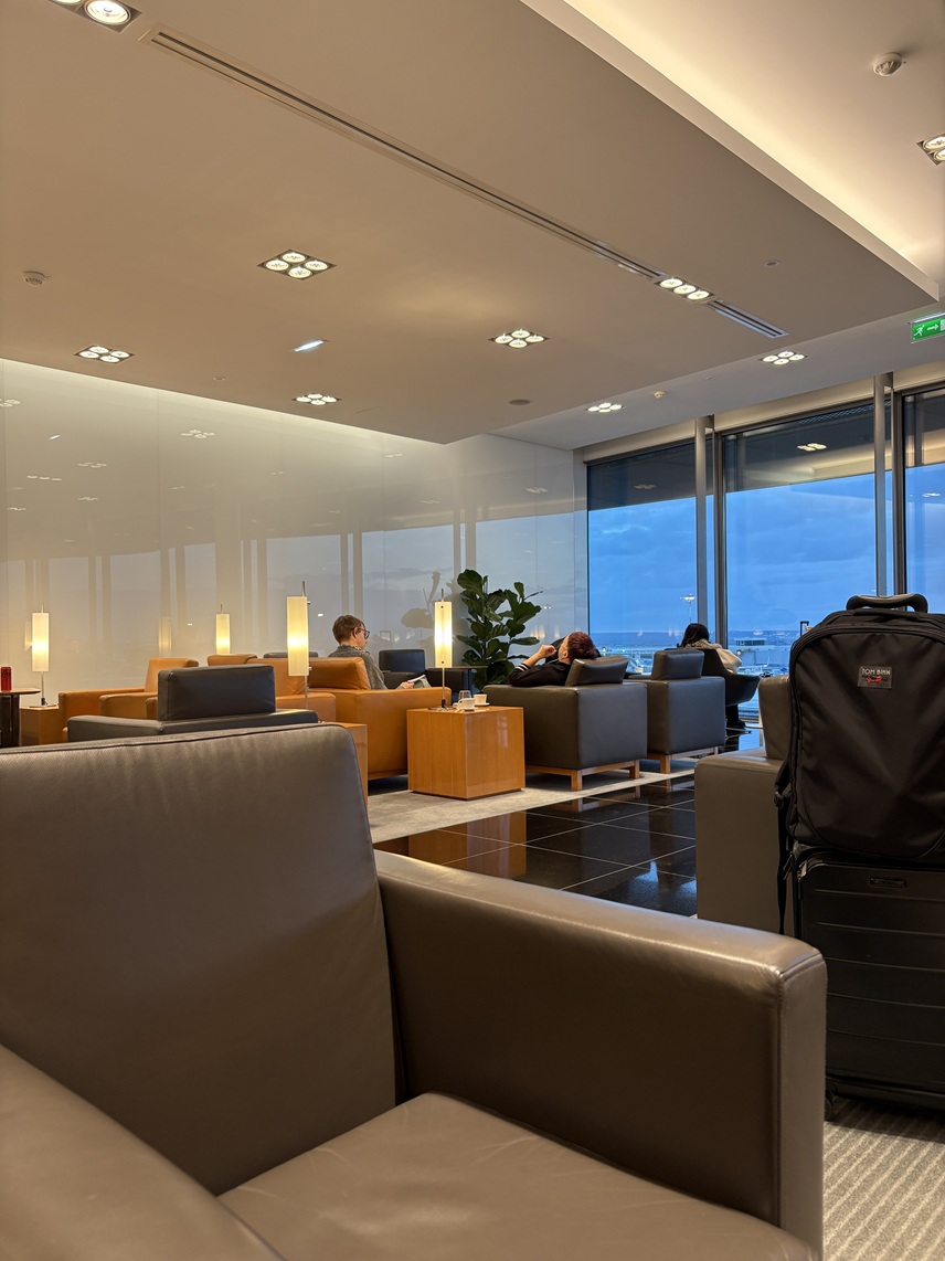 CX のラウンジは2025年12月にオープンしたそうで、奥が一面ガラス張りというこの空港にしては優れた眺望を持ちます。家具も工夫が凝らされており、良い空間でした。
