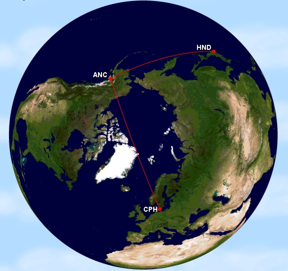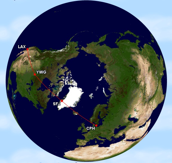 北極ルートの開拓者はスカンジナビア航空 SAS です。最初のルートは1954年11月15日に就航したコペンハーゲン (CPH) とロサンゼルス (LAX) 線でした。これは Douglas DC-6B (プロペラ機) により、グリーンランドの Kangerlussuag (SFJ)、カナダの Winnigpeg (YWG) の2空港を経由して運航されました。合計 5,650 miles ぐらいの道程になります。
